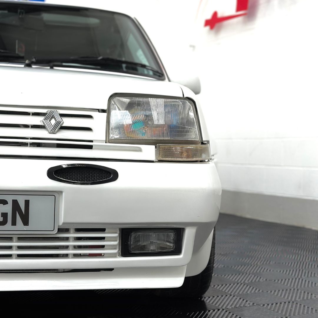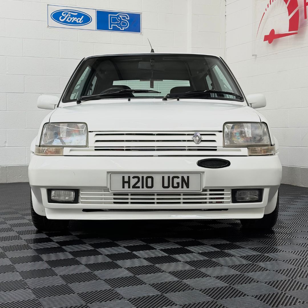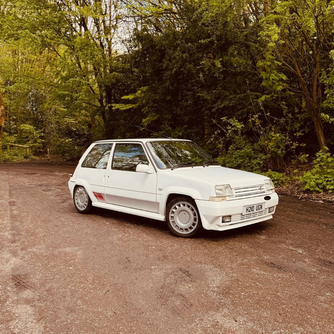 The Renault 5 is in great condition, gleaming in white riding on the turbines.