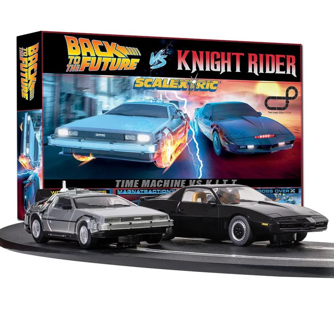 The Scalextric 1980s TV Back to the Future vs Knight Rider is the ultimate 80s Scalextric battle.