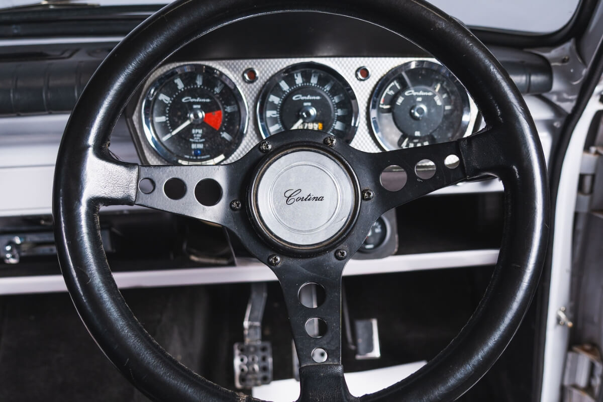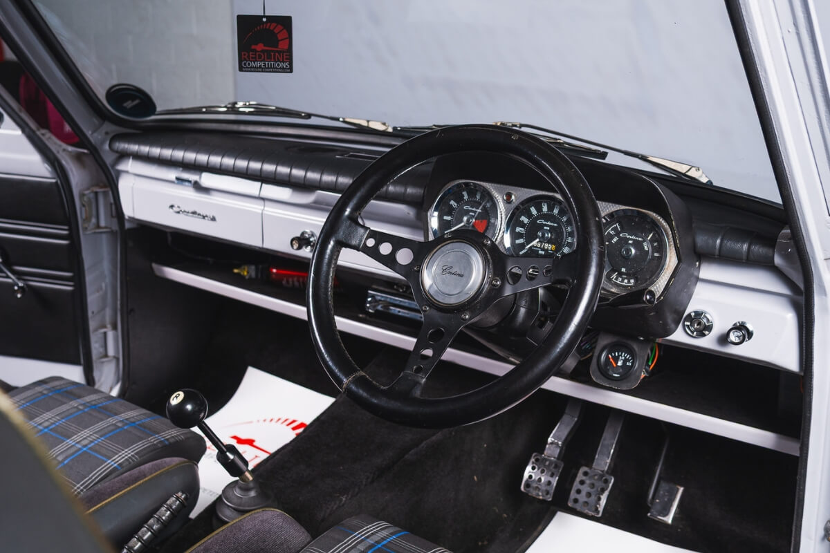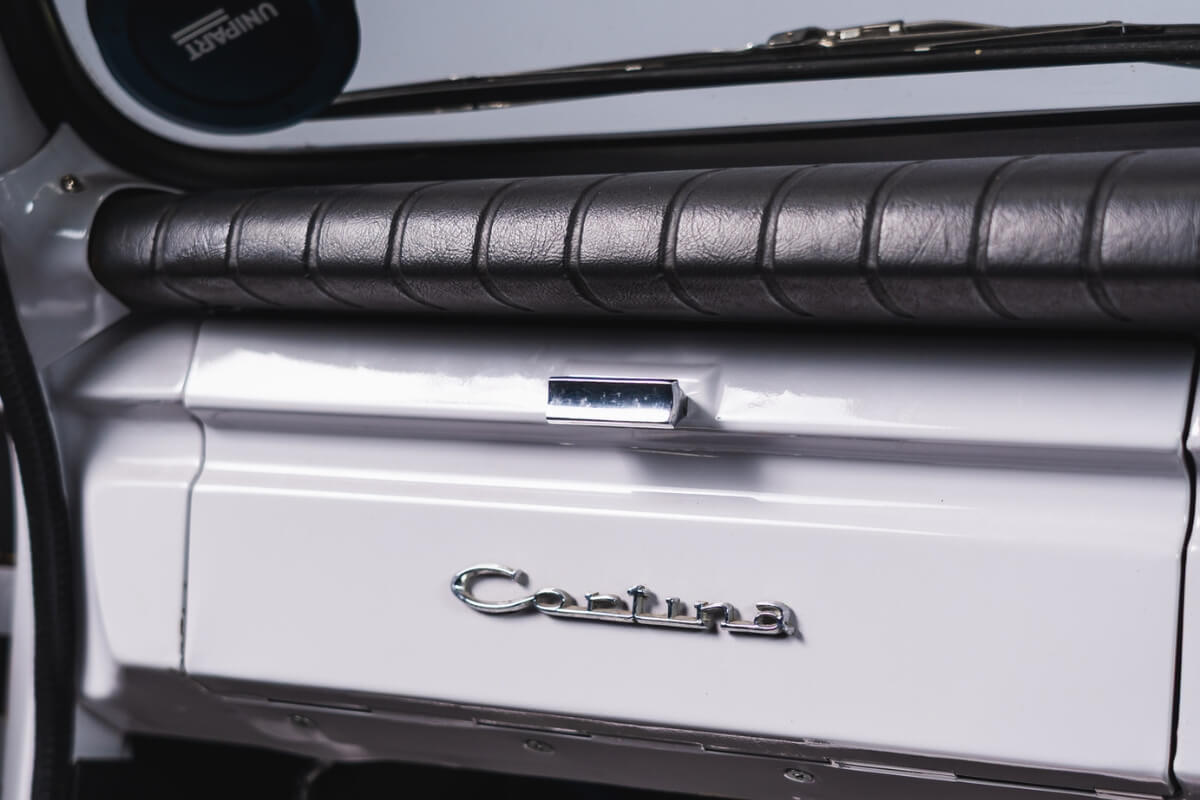 Inside there are comfy Recaro seats that have been retrimmed, whilst the carpet, roof lining, door cards and rear trim panels were all replaced during the restoration. In the boot there’s the original floor carpet and also a custom fuel tank fitted in the standard Cortina floor location with a fully working aftermarket gauge up front to suit.