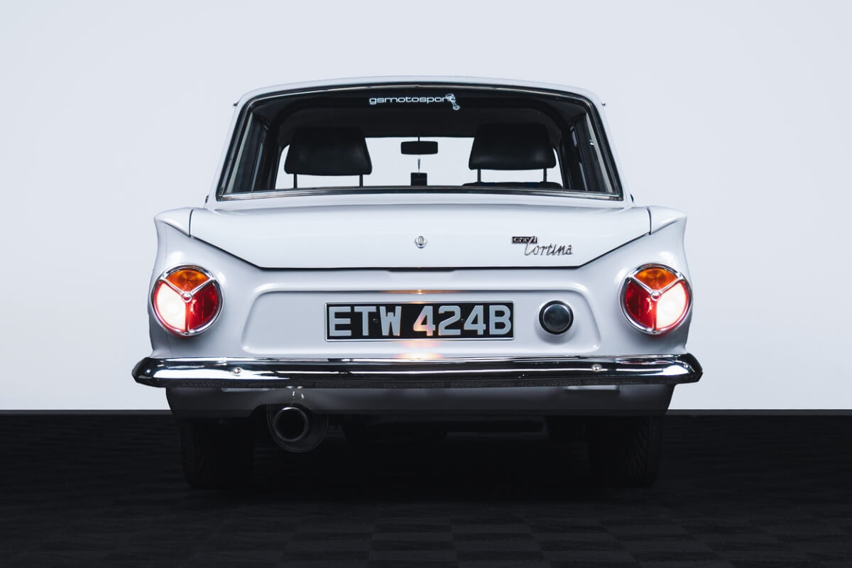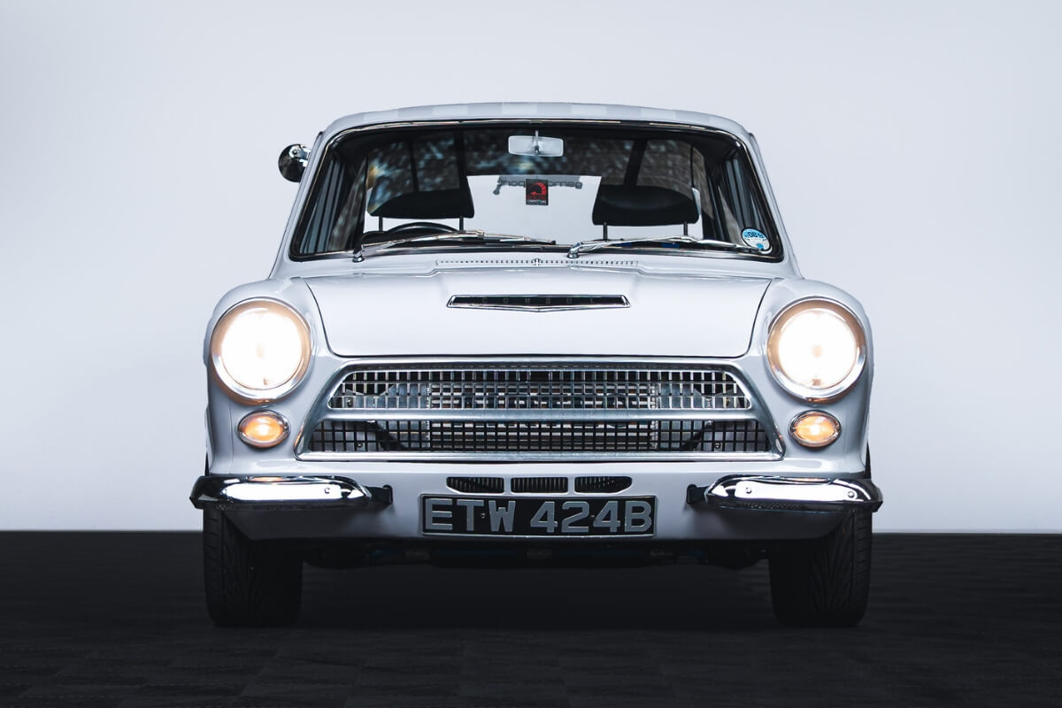 1964 Pre-Air Flow Cortina painted Mk2 Jaguar Pearl Grey with a painted chequered roof, export braces, GT badges, quarter bumpers